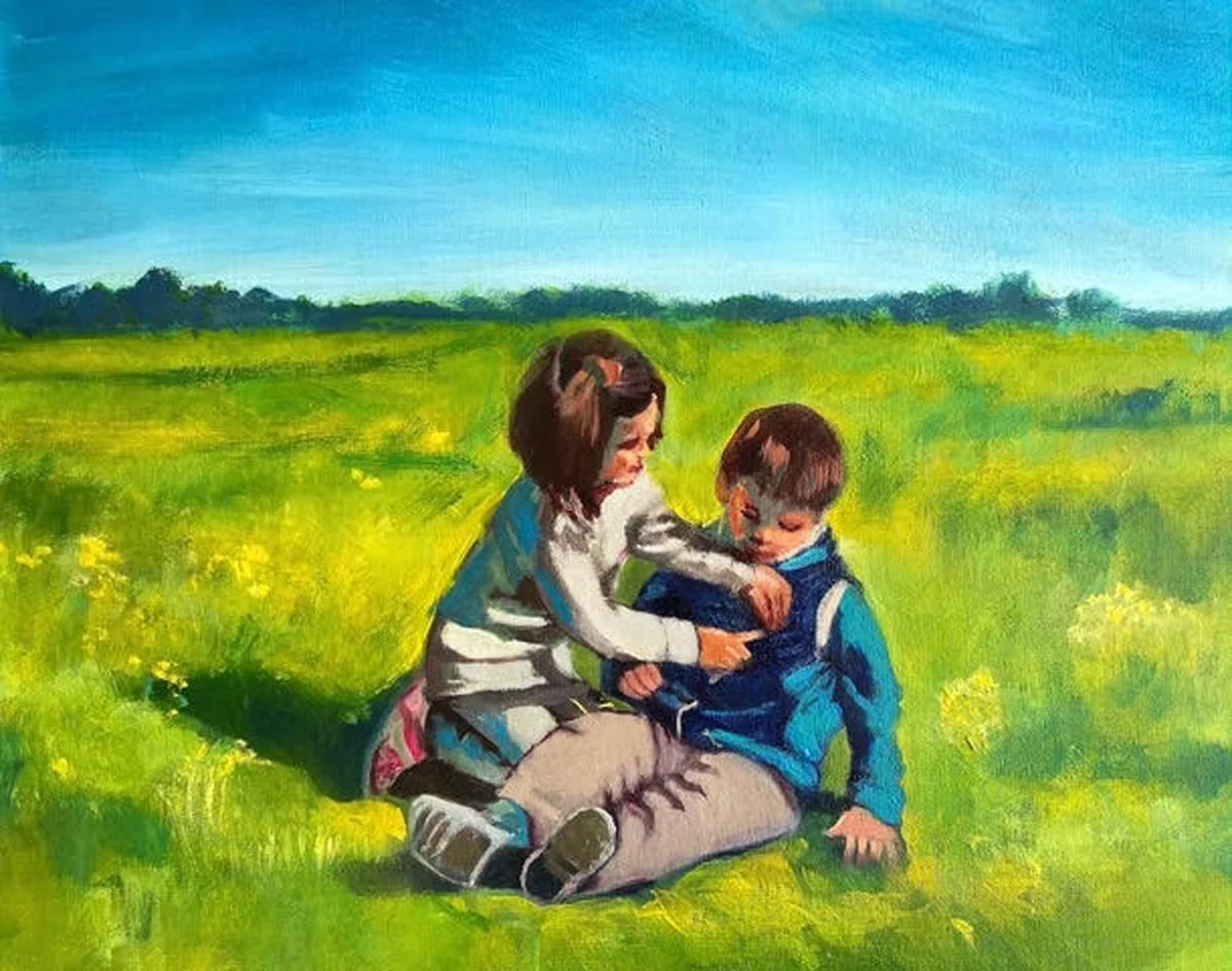 Innocent children playing in a garden, the sister assisting her little brother pulling something out from his pocket. This act truly captivated me to seal this moment on the canvas.