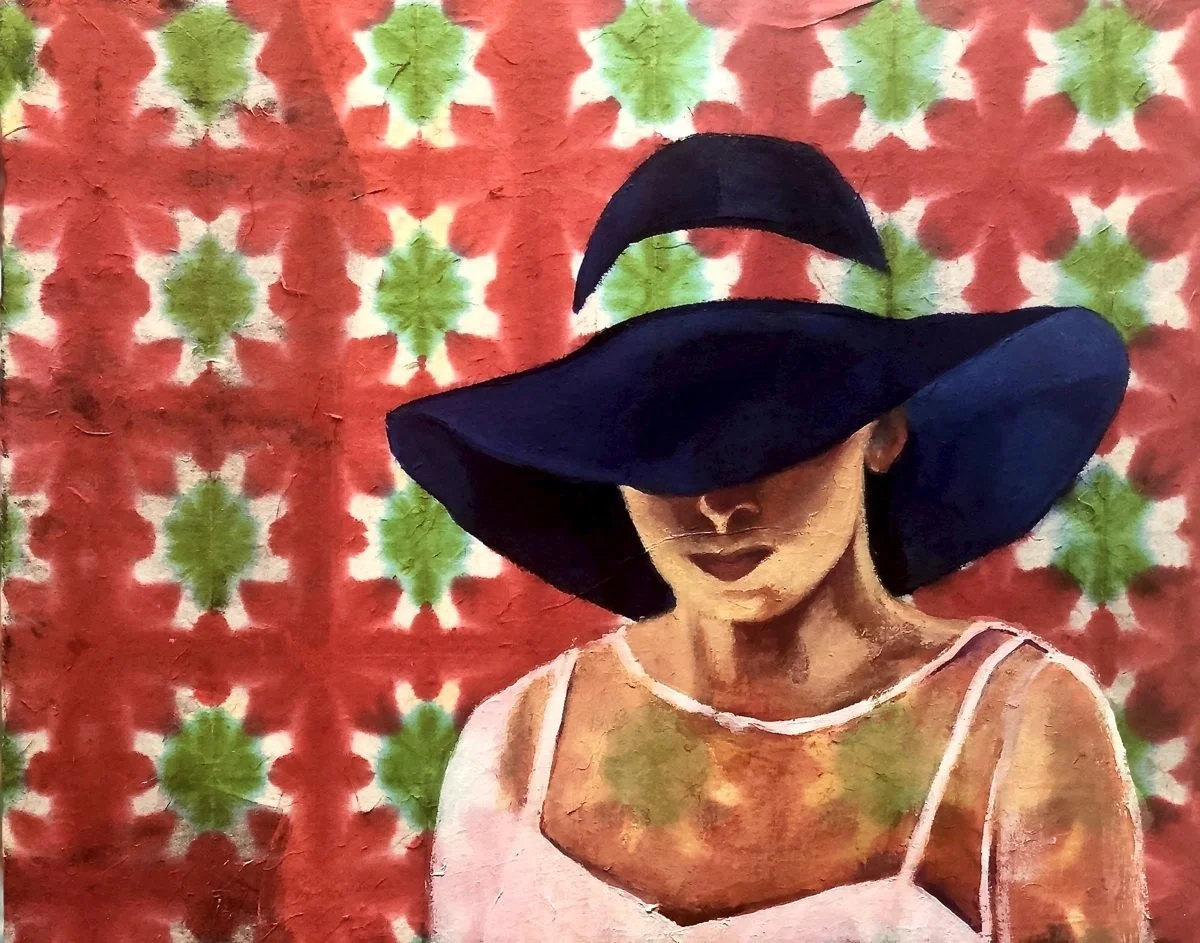 I painted this woman in an oversized hat on this beautiful handmade paper pasted on canvas and painted her into the paper, while keeping parts on untouched paper into her hat and dress. Her covered eyes and hidden top half of the face creates a sense of mystery and makes one feel that she’s deeply in thought.
