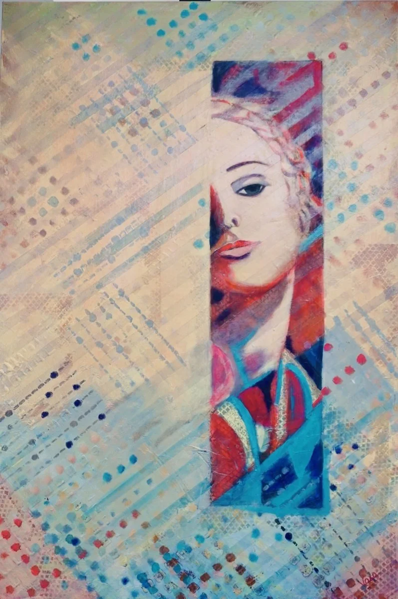 A girl is peeping through a window in an intriguing way. She does not appear to be afraid if detected, appears to be inquisitive. This measures 36 x 24 x 1.5" in size and weighs 7 lb.