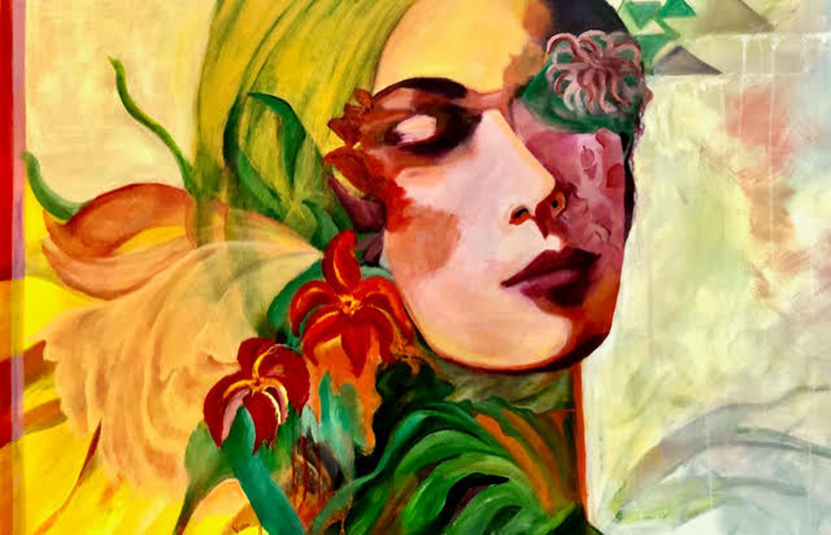 This painting represents the need for humanity to merge and identify with nature to protect it for our future generations. Again, I personify earth as a beautiful woman adorned with flowers and foliage. This measures 30 x 48 x 1.5" in size and weighs 12 lbs.